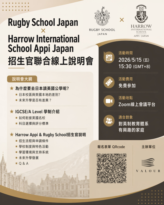 Rugby School Japan × Harrow International School Appi 招生官聯合線上說明會2026.4.14活動時間:2026/5/15 (五) 15:30 (GMT+8) https://valour.com.tw/wp-content/uploads/2026/04/rugby_harrow_poster.png 2025 1620 service /wp-content/uploads/2022/07/logo1.png.png service2026-04-14 16:47:252026-04-23 15:35:34Rugby School Japan × Harrow International School Appi 招生官聯合線上說明會